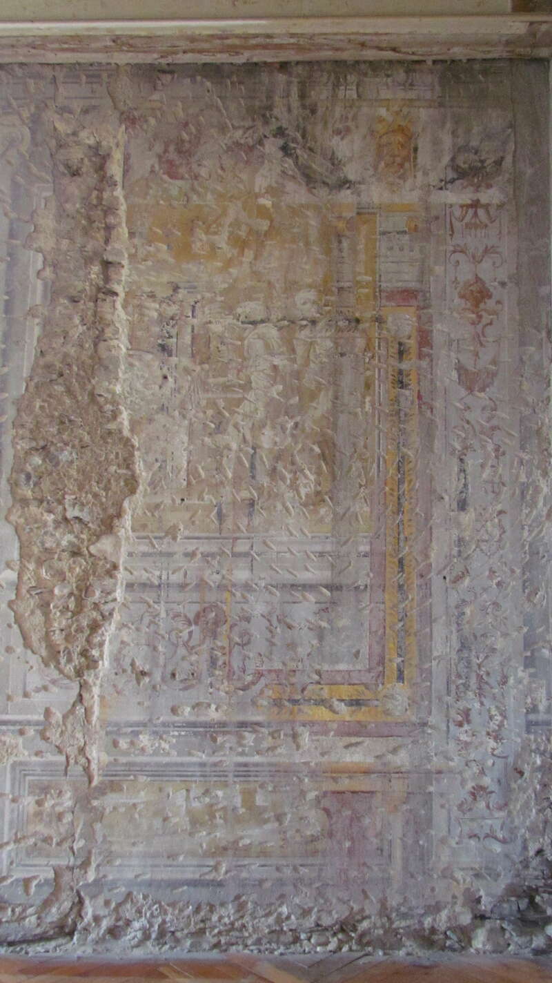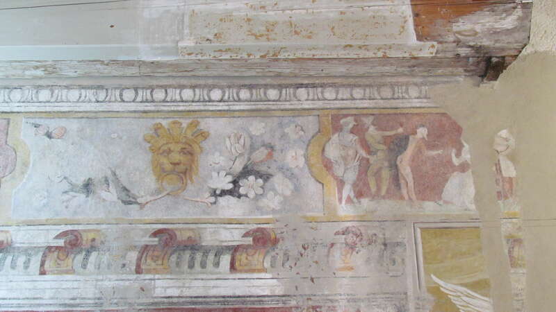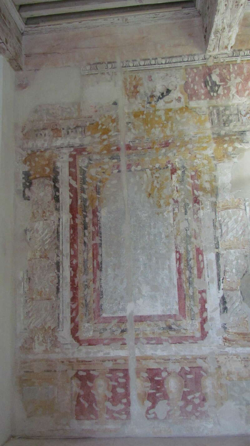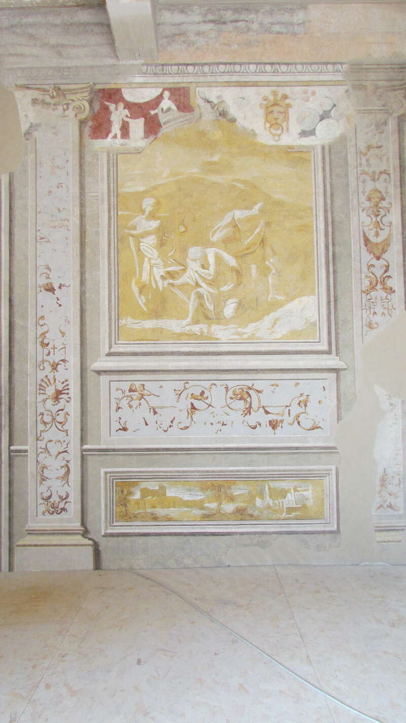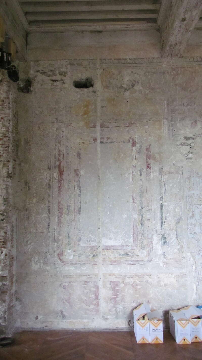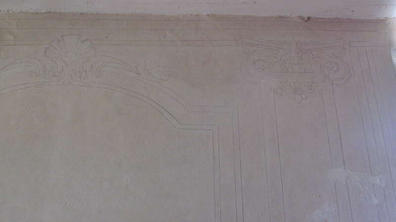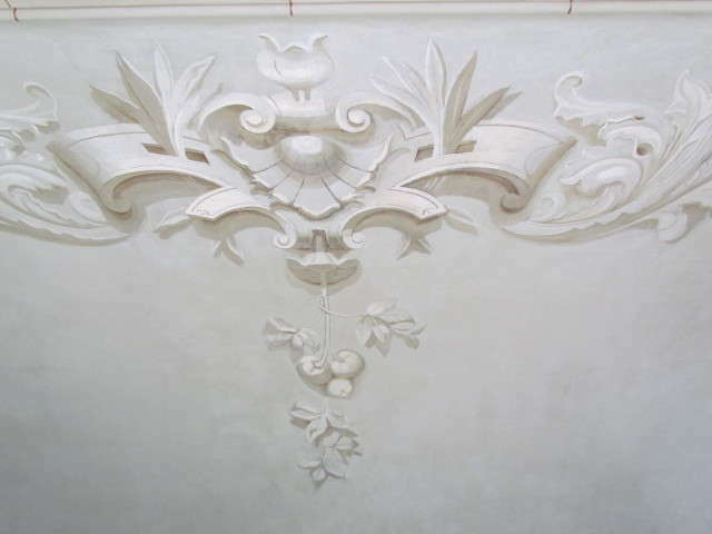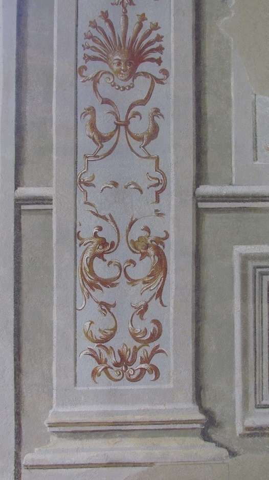 Le second décor daté de 1706 représente une architecture feinte de pilastres ornementés de frise de grotesque alternée avec des panneaux présentant des scènes figuratives