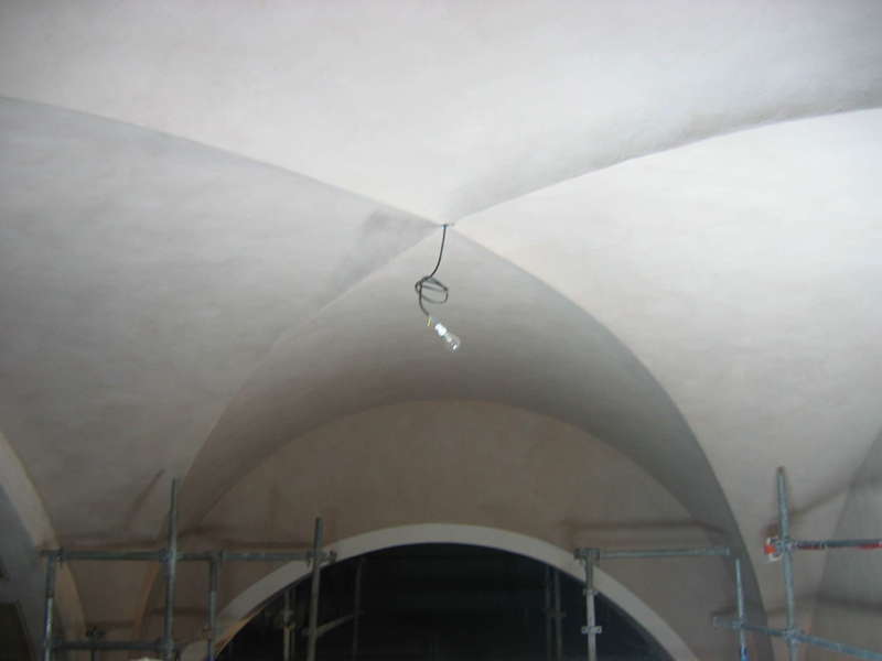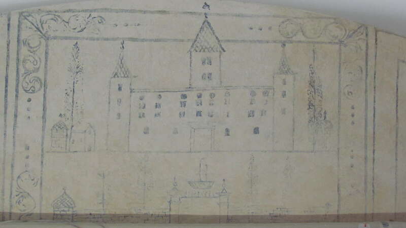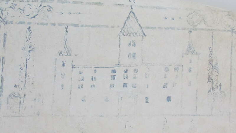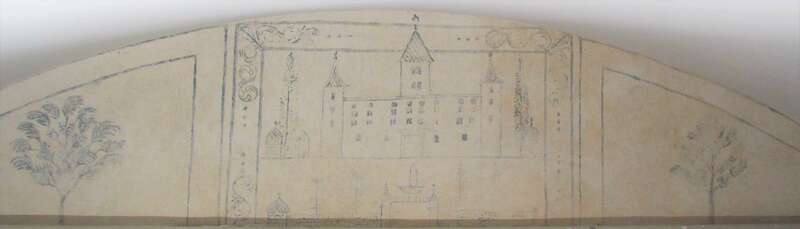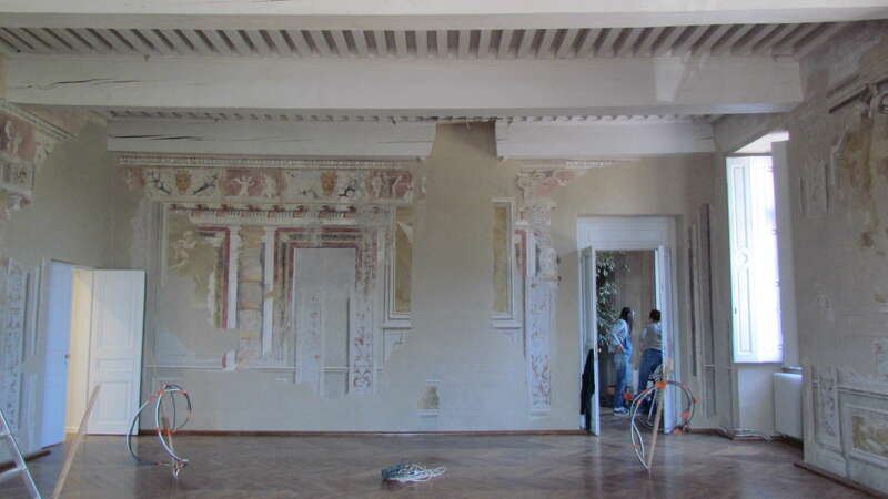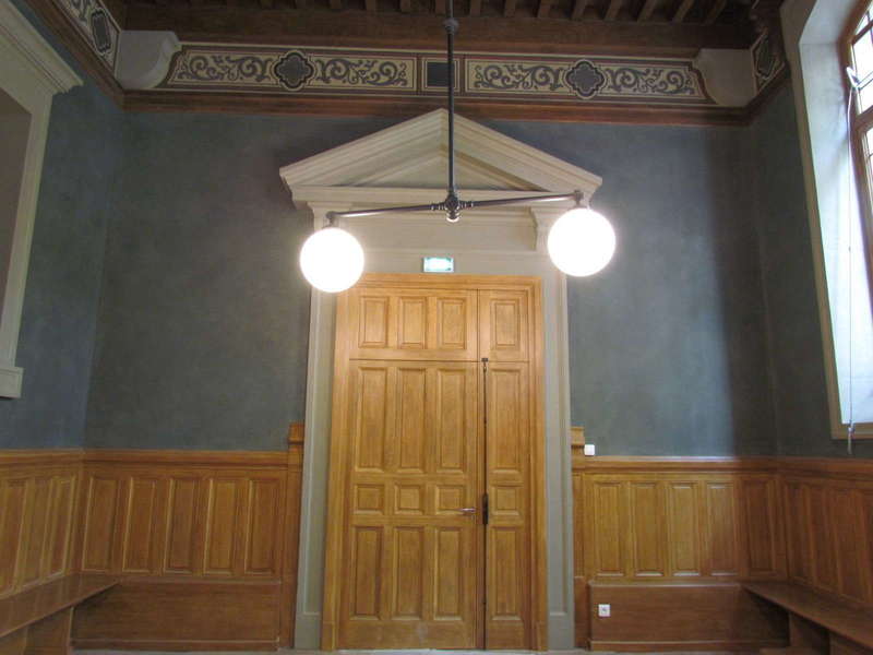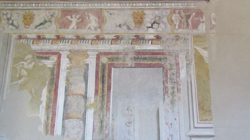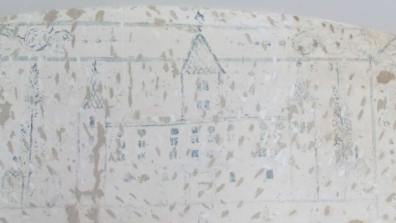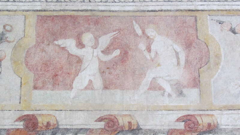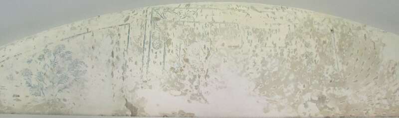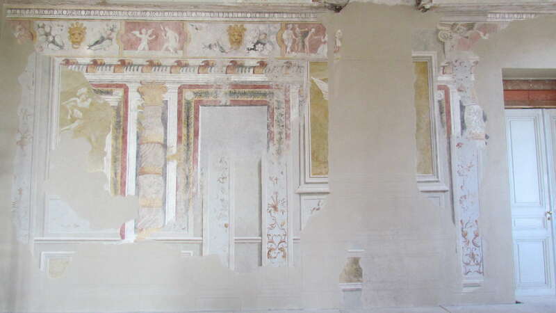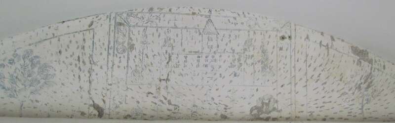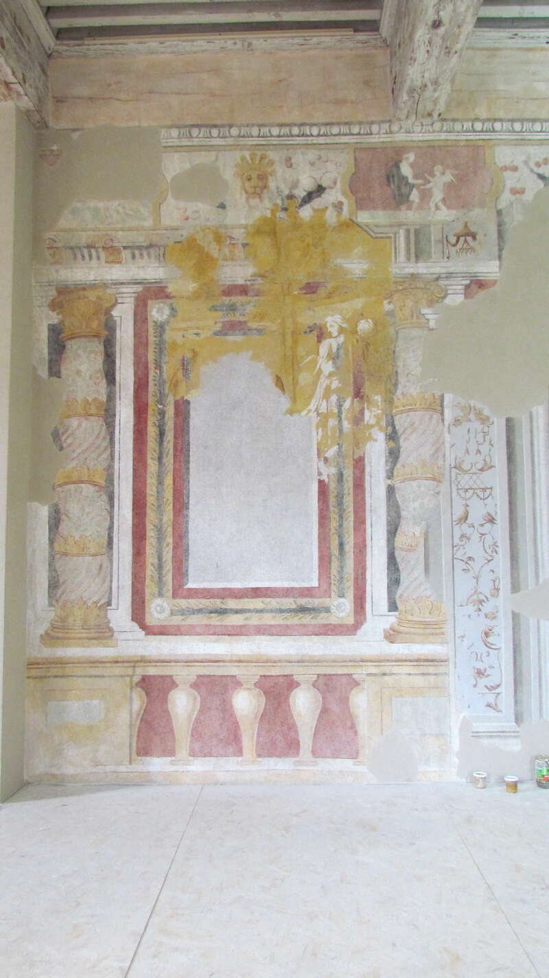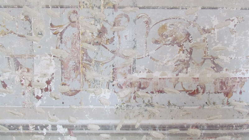 Le second décor daté de 1706 représente une architecture feinte de pilastres ornementés de frise de grotesque alternée avec des panneaux présentant des scènes figuratives