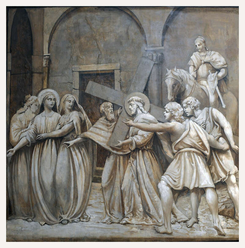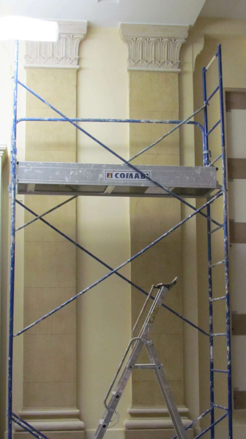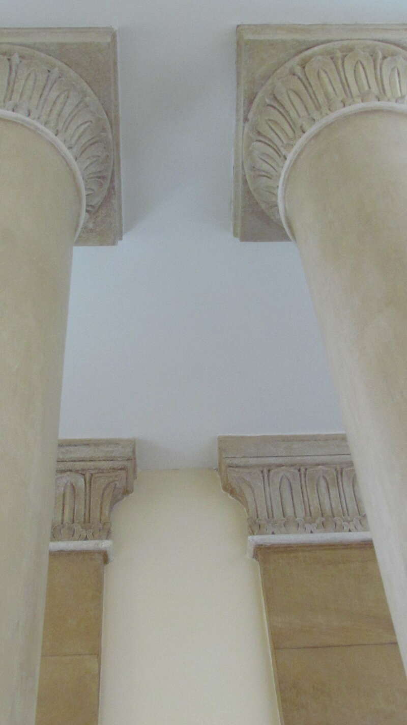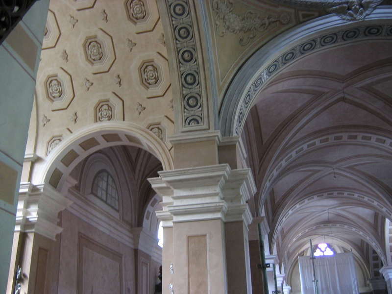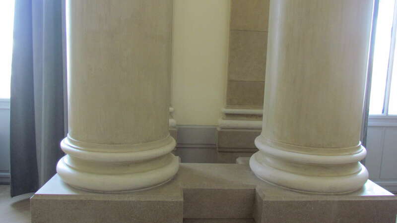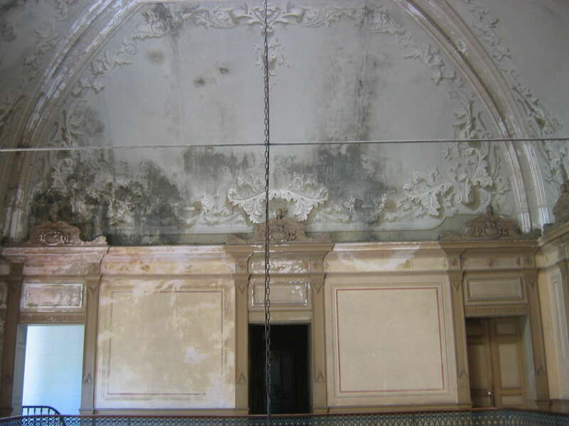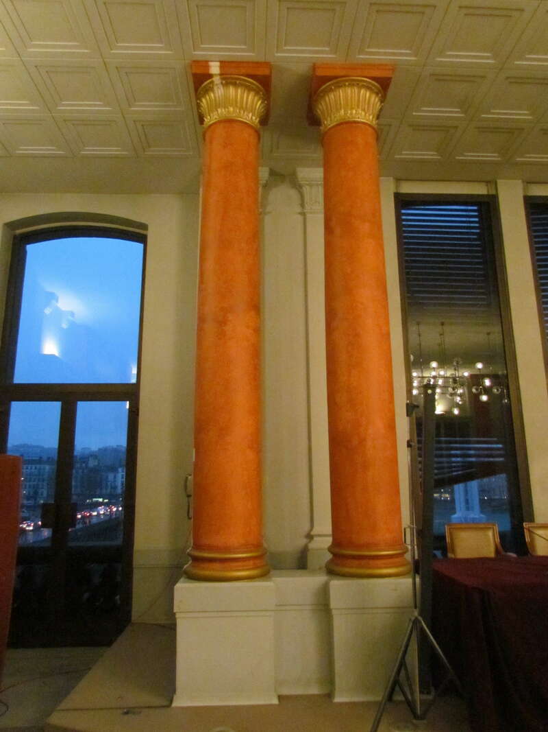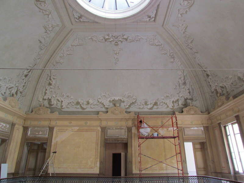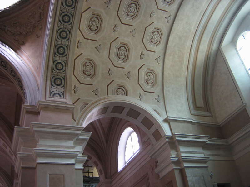 Le second décor daté de 1706 représente une architecture feinte de pilastres ornementés de frise de grotesque alternée avec des panneaux présentant des scènes figuratives