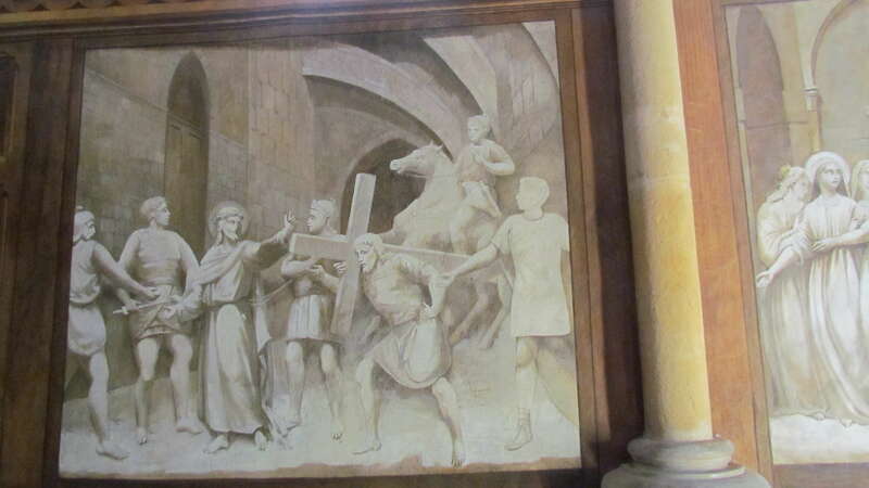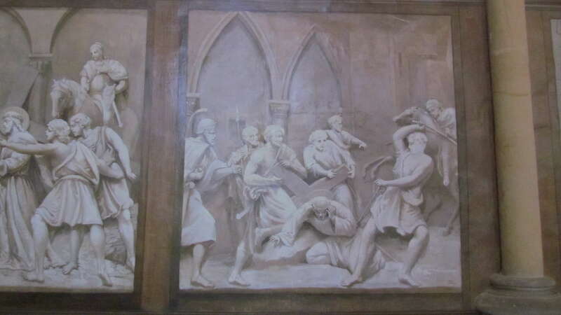 Descriptif : Le premier décor daté de 1625 est une composition rythmée de panneaux et de colonnes torses agrémentées de végétation. En partie supérieure de petites scènes inspirées de peintures flamandes animent une large frise.